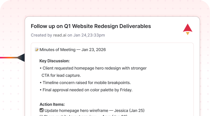 Astravue + Read.ai eliminates the "meeting-to-task" gap. By bridging the world’s smartest AI notetaker with Astravue’s execution engine, we ensure that every brilliant idea becomes a trackable reality.