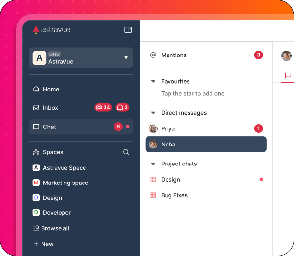 Most tools treat “Chat” as an afterthought or a separate tab. Astravue positions chat as the pulse of the project. We offer a middle ground for agencies: the power of a robust project management tool with the speed of a high-end chat app.