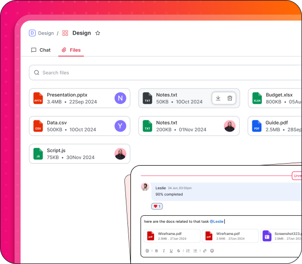 Drop images, docs, and assets directly into chat threads so feedback happens where the work is.